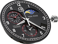 60 seconds chronograph counter with central hand, display of moon phase, 60 minutes and 12 hours coaxial counter.