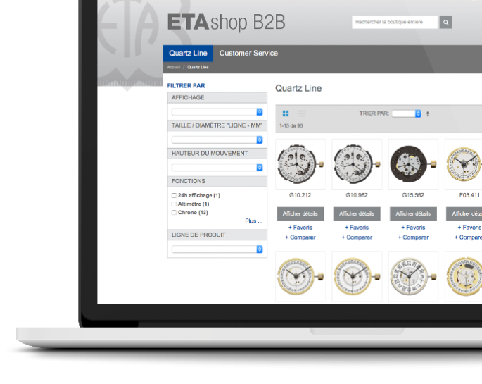 L'interface commerciale en ligne pour les mouvements quartz : choisir, comparer, configurer, commander et suivre.