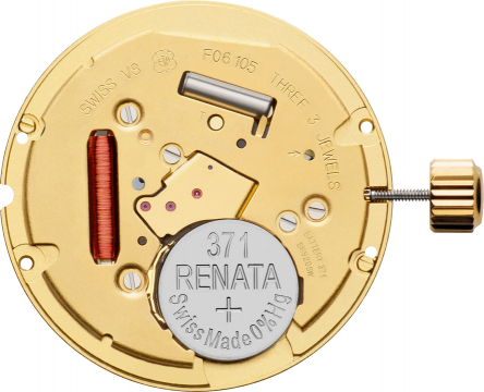 The ETA F06.105 calibre is an 11½’’’ movement displaying hours, minutes and with or without seconds in the centre, with HeavyDrive technology.