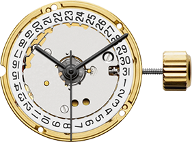 The ETA F03.115 calibre is a 7¾’’’ movement displaying hours, minutes, with or without seconds in the centre and date, with HeavyDrive technology.